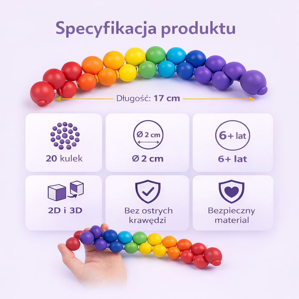 Dziecko może skręcać i układać różne kształty, dzięki czemu zajmuje się na dłużej — bez ekranu. Świetne do domu, szkoły i w podróży, gdy potrzebujesz spokojnej aktywności.